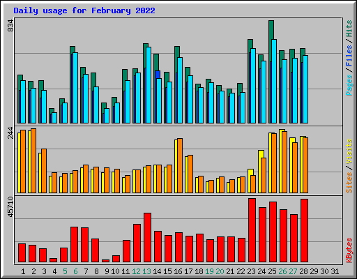 | Day | Hits | Files | Pages | Visits | Sites | KBytes | ||||||